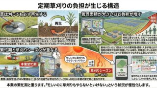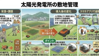 大成物産「現地にいなくても草刈りが進んでいる」——それを実現するのがクロノスです。「現場にいなくても草刈り管理が進む仕組みを作りたい」——遠隔地の発電所・無人の遊休地・複数拠点の施設管理など、常駐できない土地の草刈りは多くの事業者が抱える課...