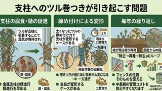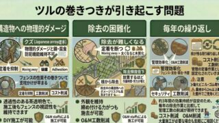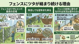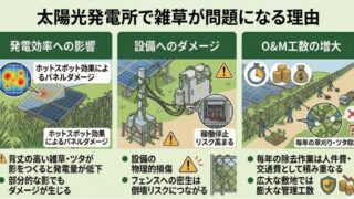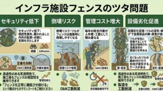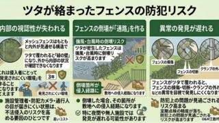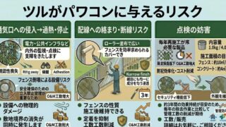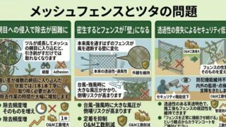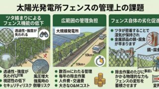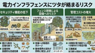 大成物産太陽光発電所のフェンスは「設置して終わり」ではありません。適切な管理がなければ、セキュリティ・設備・発電効率のすべてに影響が出ます。太陽光発電所のフェンスは、不法侵入の抑止・設備の保護・安全確保という重要な機能を担っています。ツタの...
